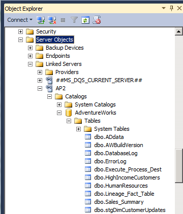 AP1 koneen SQL server default instanssin Linked Server AP2 Adventure Works kantaan.