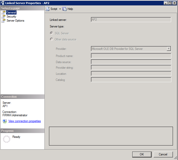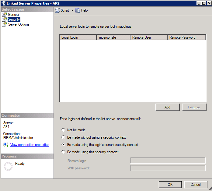 SQL servereiden välillä konfigurointi on todella suoraviivaista. Labraympäristössä voidaan vielä käyttää admin tunnuksia, joten security välilehden tunnus asetuksiinkaan eitarvitse koskea. Oikeassa ympäristössä security on yleensä asetettava tietylle user accountille.