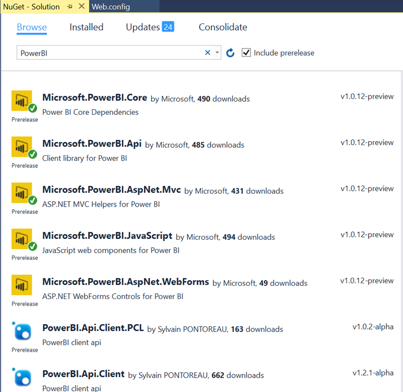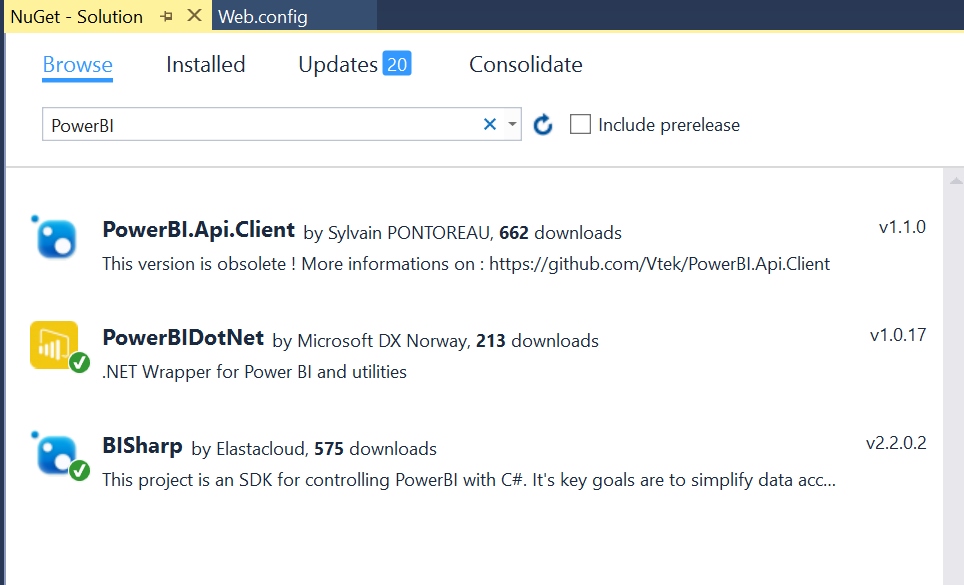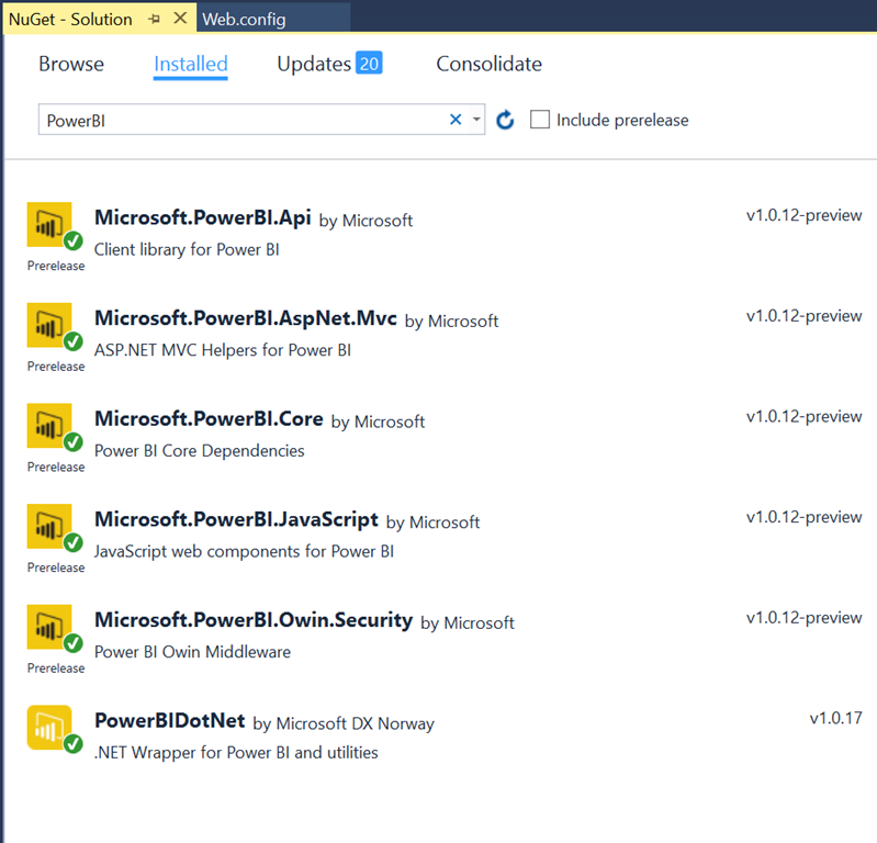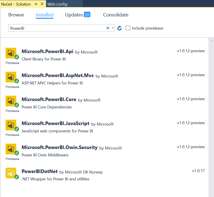Ensimmäisenä temppuna varmista että oikeat nugetit on mukana. Itse jouduin lataamaan kaikki yksitellen ja kokeilemaan missä vaiheessa virheet loppuivat. Alinna löytyy ’tältä se näyttää’ kuva siitä kun oikeat nugetit on tämän päivän powerbi embedded version kanssam sulassa sovussa. Tämän kuvasarja kertoo maanläheisen tavan varmistaa että saatavilla olevat, asennetut ja päivityksiä saatavilla versiot ei aiheuta liiemmin päänvaivaa