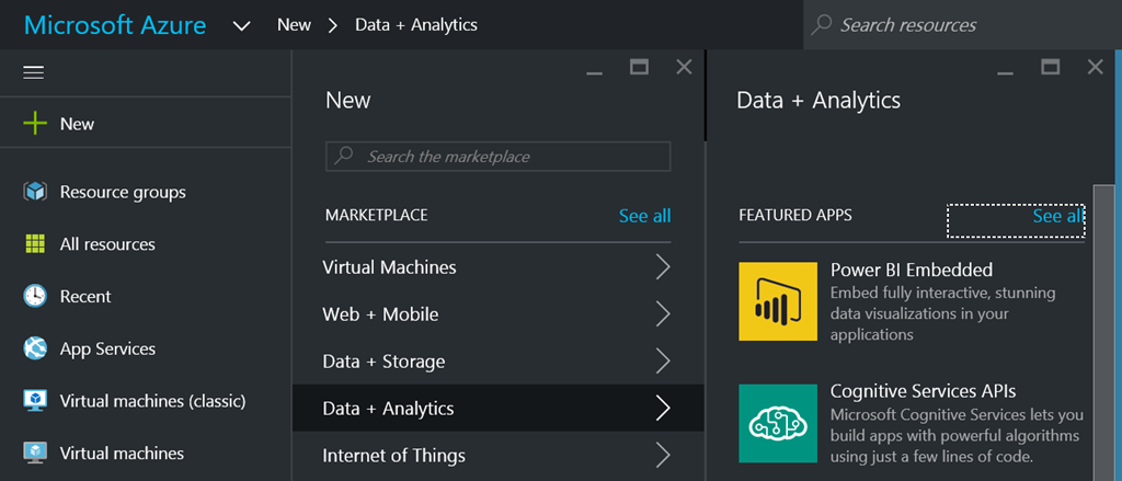 Resurssiryhmään tulee tehdä uusi PowerBI työtila. Valitse – New – Marketplace / Data + Analytics / PowerBI Embedded