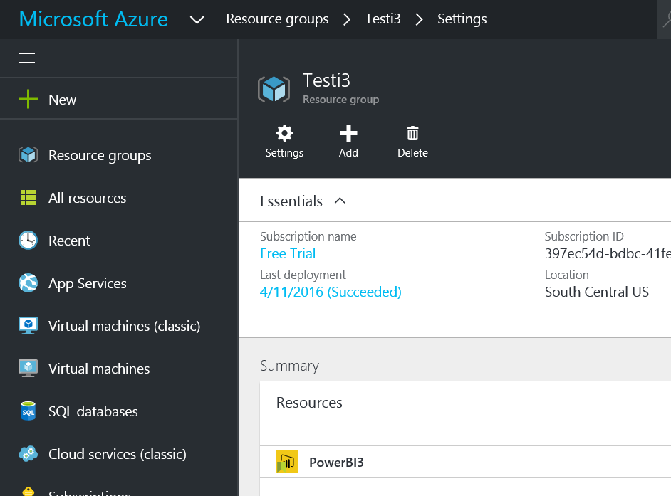 Tee uusi resurssiryhmä. Huomaa että vain South Central US on tarjolla tässä preview versiossa.