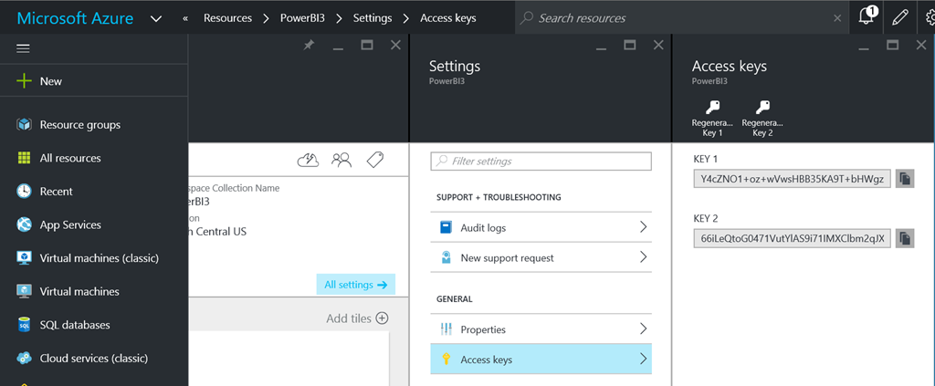 ’Access keys’ osa löytyy nyt oikeanpuolimmaisena näytölläsi. valitse ‘copy’ settings kohdasta ja liitä sen key 1 muistiinpanoihisi. Samoin Työtilan teossa kirjoitamasi muutkin tiedot. Tarvitset niitä provisiointiin tehdtyyn apuohjelmaan, jonka voi ladata täältä. https://github.com/Azure-Samples/power-bi-embedded-integrate-report-into-web-app/